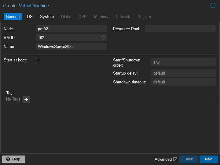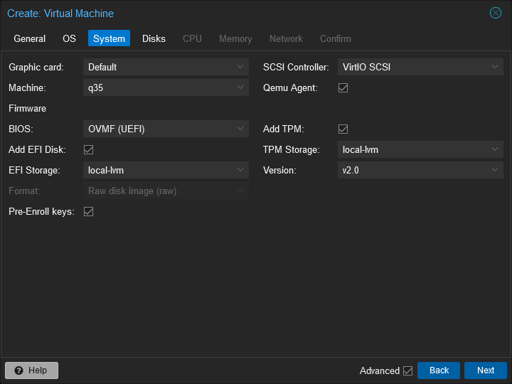Il faut activer le "qemu-agent", sélectionner "local-lvm" pour le stockage de l'EFI et sélectionner "local-lvm" pour le stockage de la puce TPM.