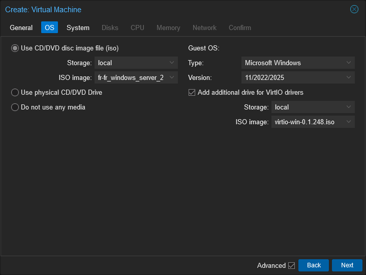 Il faut aussi vérifier que BIOS = "OVMF (UEFI)" et que le contrôleur SCSI soit : "VirtIO SCSI" (attention il faudra installer le pilote plus tard).