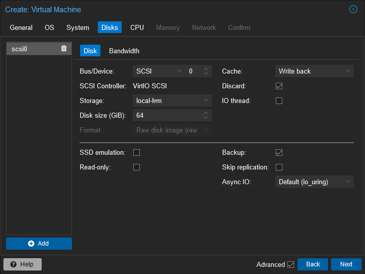 Choisir "SCSI" dans Bus/Device, "Write back" dans cache (cela permet d'améliorer les performances) et "Discard" pour gérer le provisionnement dynamique.