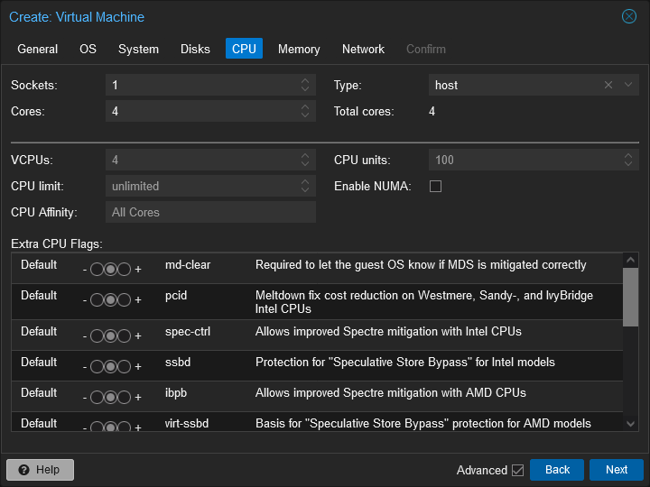 Choisir le nombre de coeurs dans "Cores", dans "Type" choisir dans la liste le dernier choix "Host".