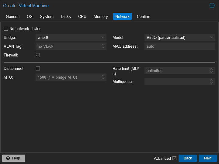 Sélectionner VirtIO (paravirtualized) dans le modèle.