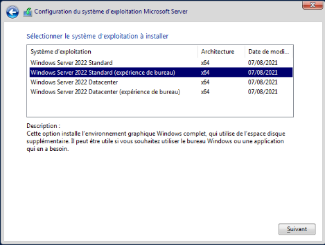 Lancer l'installation de Windows, puis choisir la version que l'on souhaite j'ai sélectionné la Standard avec Expérience du Bureau pour avoir une interface graphique.