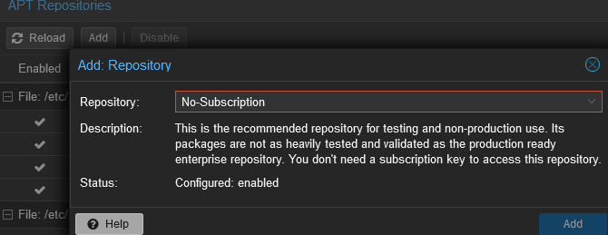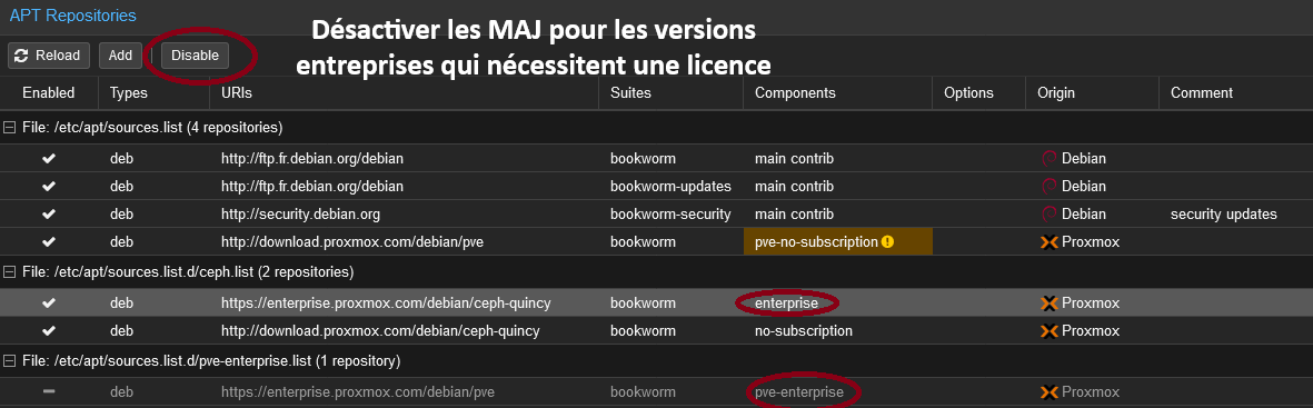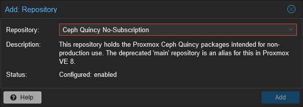 Après, il faut ajouter les dépots "No-Subscription" et "Ceph No-Subscription" pour pouvoir bénéficier des mises à jour.